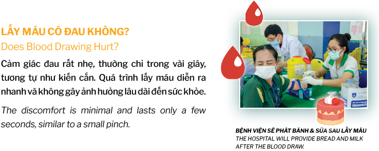 Lượng máu được lấy chỉ chiếm một phần rất nhỏ so với tổng lượng máu trong cơ thể. Cơ thể sẽ nhanh chóng tự bù lại. Một số trường hợp có thể hơi đau hoặc bầm nhẹ tại vị trí lấy máu và sẽ tự hết sau thời gian ngắn.