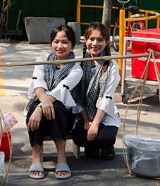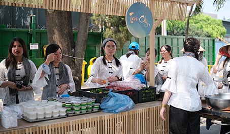 Traditional áo bà ba and food stalls featuring spring rolls, fresh fruits, sweet soup, snacks,