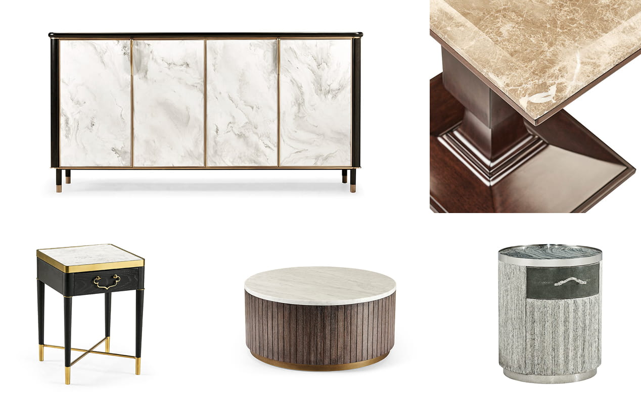 A highly polished marble or stone surface adds light and luxury to tables and decorative accessories. At Jonathan Charles we work directly with quarries and stone suppliers, choosing each slab for the quality of its colour, veining or suitability for the chosen project. Whether you chose a gleaming white carrara marble, black marble with delicate white veining or a glittering granite, our specialists will source the finest stone for your needs.