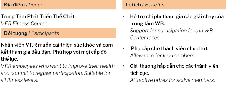 CLB Chạy Vui Khỏe V.F.R là một chương trình thuộc Trung Tâm Sức Khỏe Toàn Diện, hướng đến